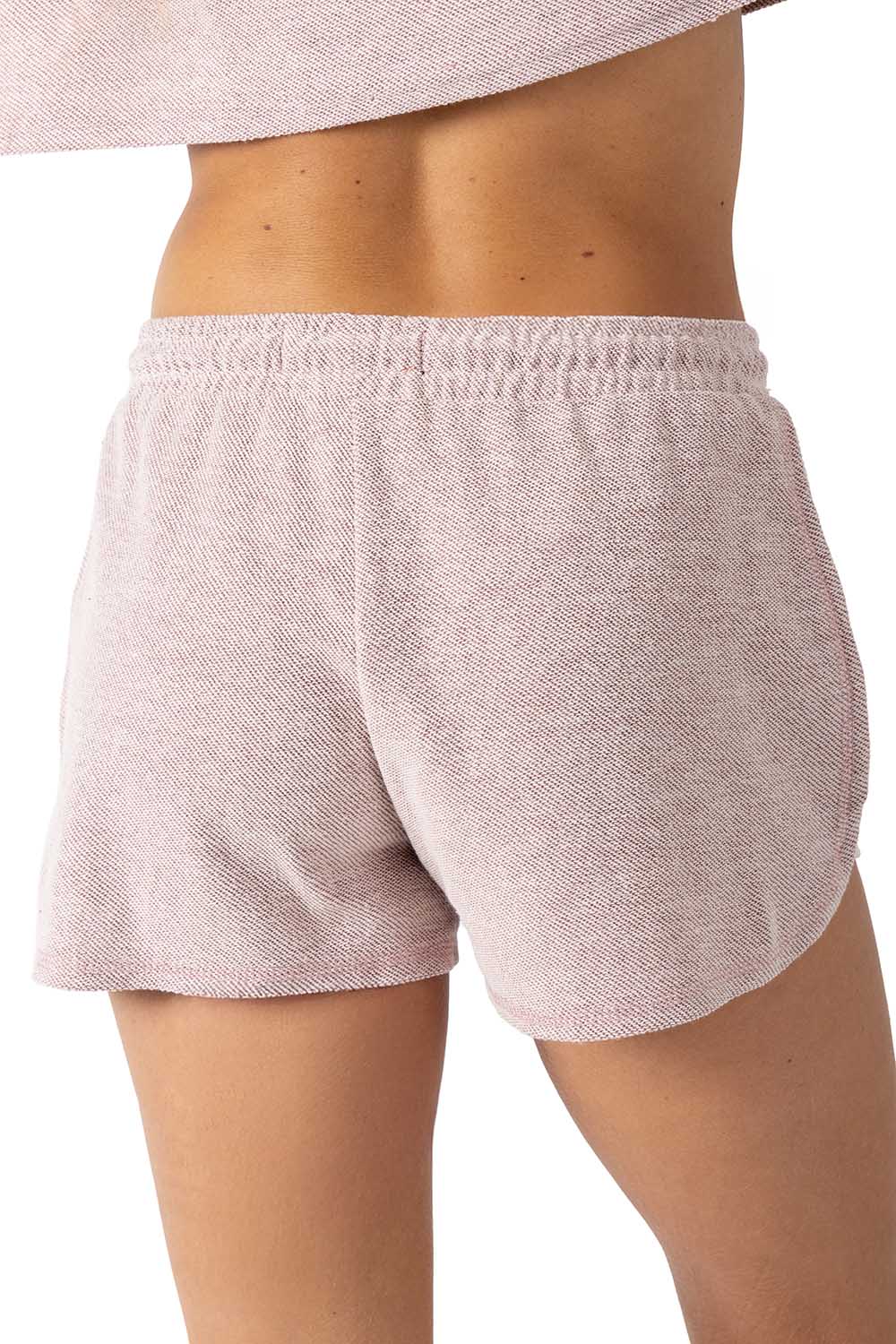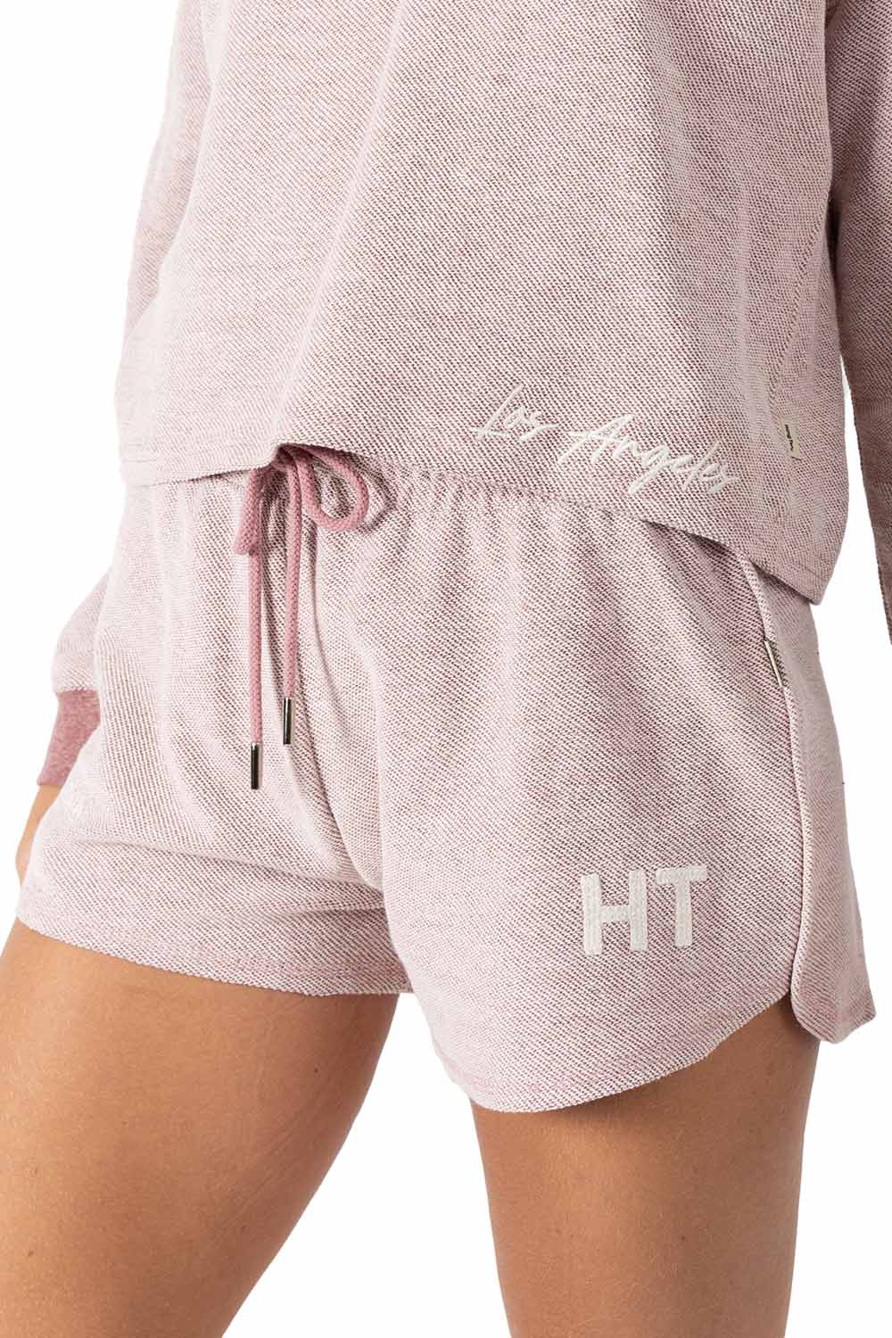 Short rosa claro para mujer con textura suave, equipado con jarra para un ajuste personalizado. Destaca su estampado «California HT» en color vino, que añade un toque distintivo y moderno. Ideal para un look casual y cómodo.
