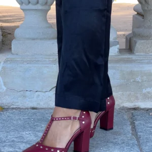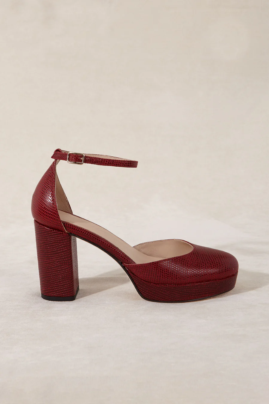 Zapato de invitada con plataforma y tacón ancho en piel con grabado tejus en burdeos. Su diseño de puntera redonda y escote marcado aporta un estilo chic y moderno. Cierre de de pulsera con hebilla regulable hipoalergénica . Presenta tacón ancho de 9 cm de altura, plataforma en parte delantera de 2 cm con plantilla de microgel para un mayor confort. Forro y plantilla de piel mestizo de cabra a tono y planta con certificado »handmade in Spain» con logo grabado a fuego. Incluye una bolsa de algodón. Diseñado y fabricado artesanalmente en España.