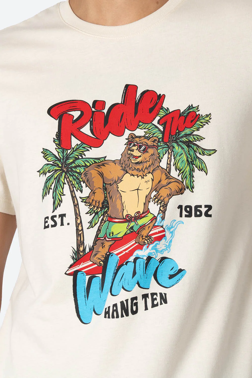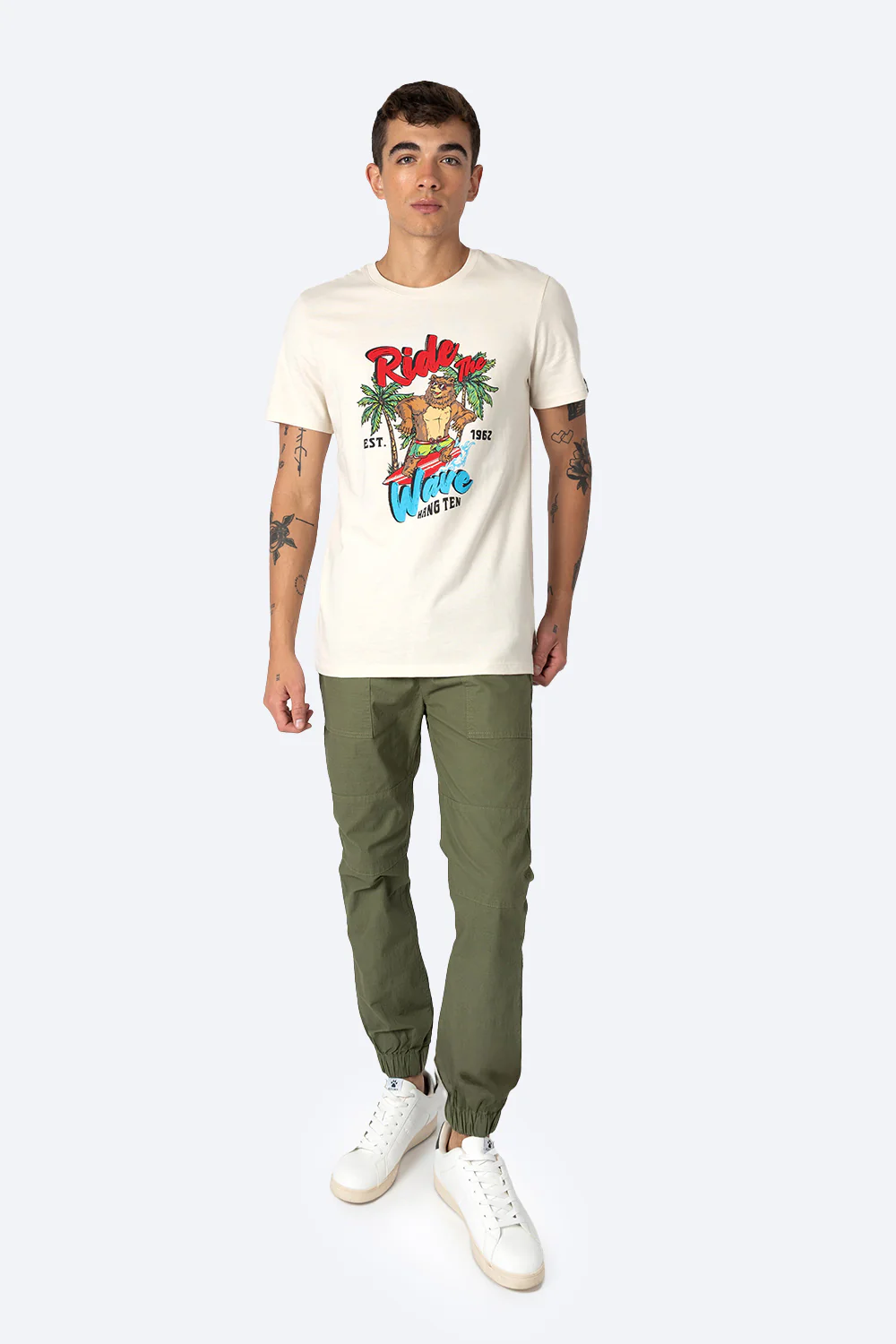 Esta camiseta beige de manga corta y cuello redondo, confeccionada en 100% algodón, ofrece comodidad y frescura ideales para el día a día. Su estampado «Ride the wave» aporta un toque auténtico y casual, perfecto para quienes buscan estilo y funcionalidad en una prenda versátil.