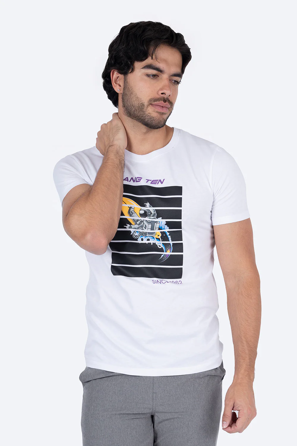 Esta T-shirt blanca de manga corta y cuello redondo está diseñada para los amantes de lo único. Su estampado «Hang Ten» refleja un estilo urbano auténtico, mientras que el tejido 100% algodón garantiza comodidad, durabilidad y transpirabilidad. Ideal para quienes buscan una prenda versátil que combine moda y funcionalidad en su día a día.