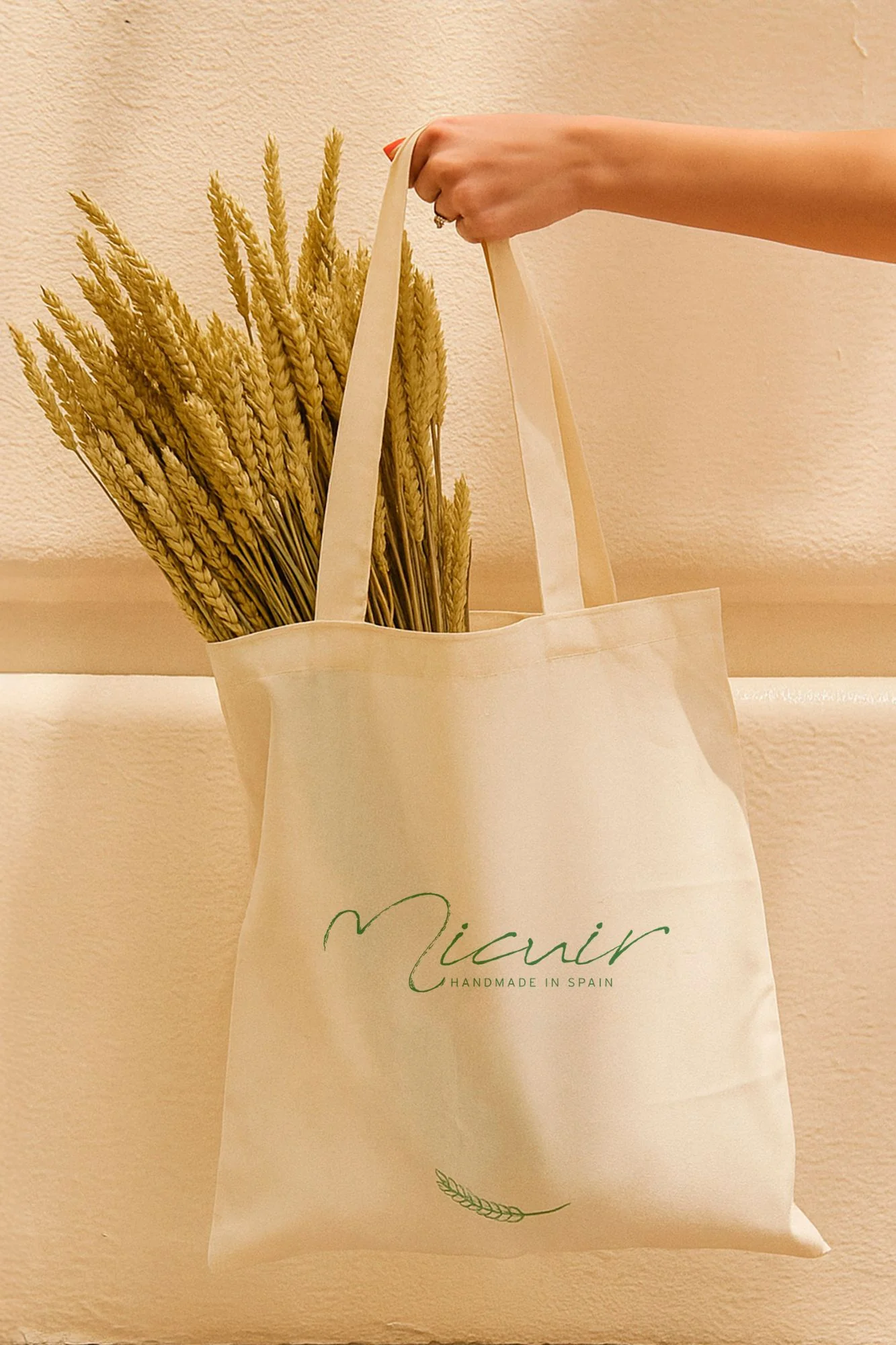 Tote bag Micuir diseñado y confeccionado en España. Diseño exclusivo con nuestro logo con nuestra icónica espiga natural estampada en la parte frontal y estampado en la parte trasera que es reflejo de la identidad de nuestra marca. Asas doble de algodón, la bolsa de tela perfecta para tu día a día.