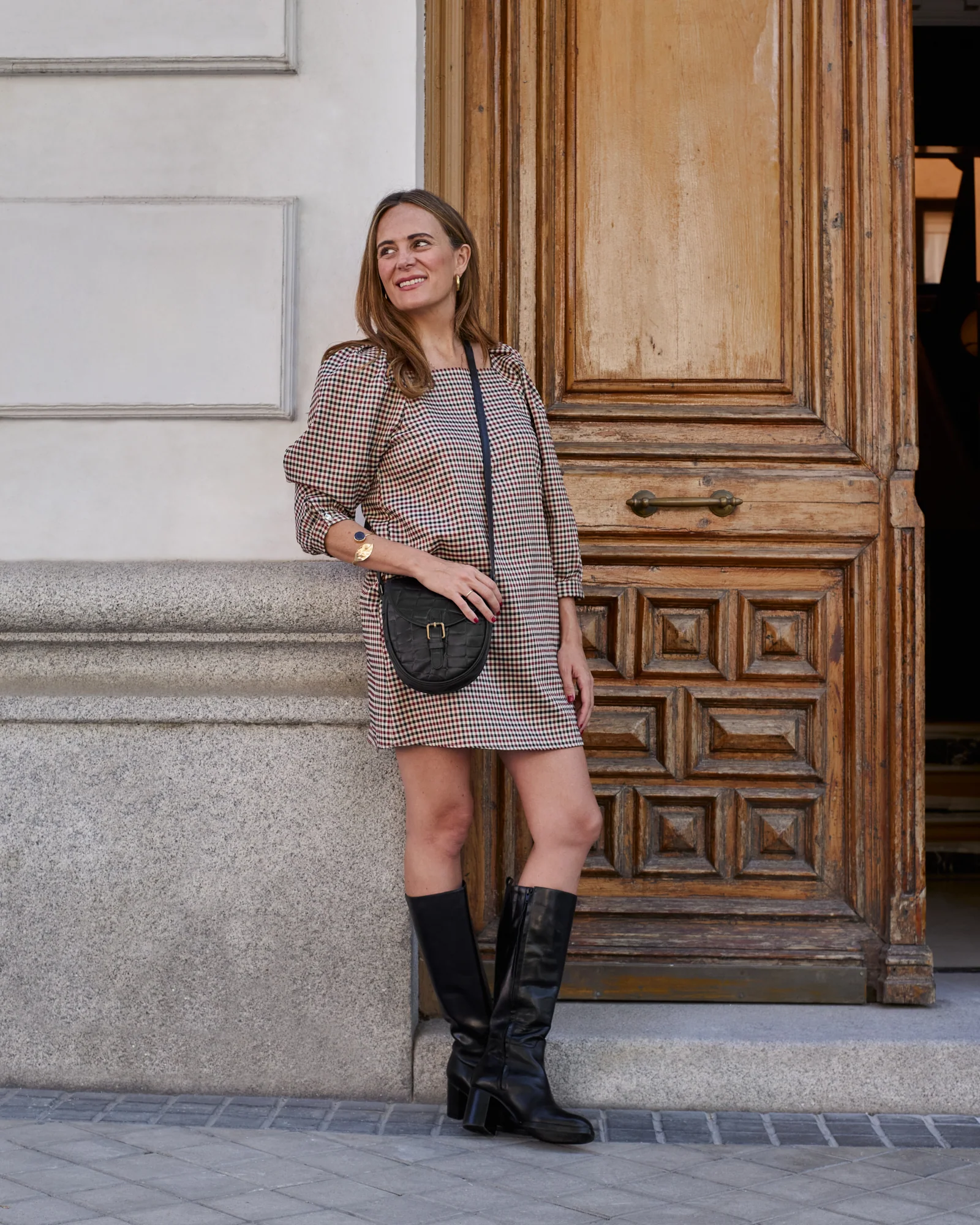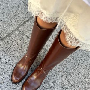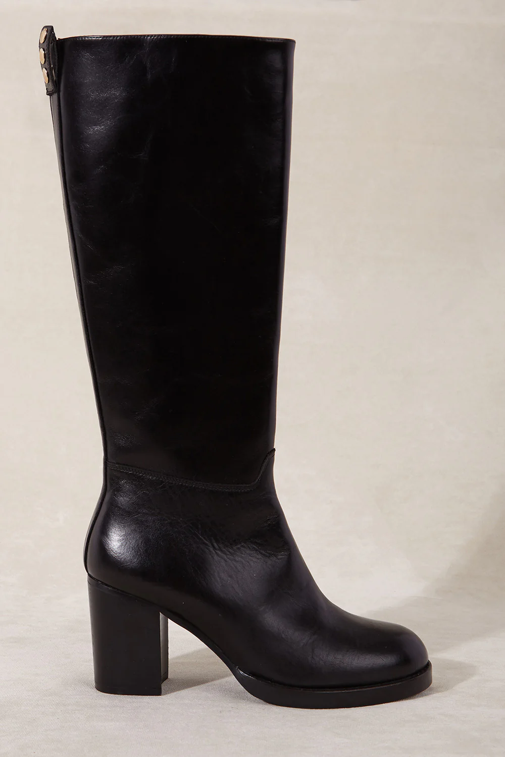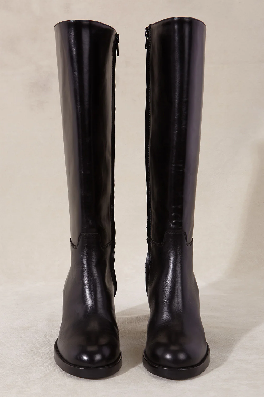 Bota de caña alta con tacón en piel negra que combina su estilo atemporal y versátil. De puntera redonda, caña ancha con trabilla superior con tachas metálicas en dorado para ayudar al calce además de cremallera en interior . Presenta un tacón ancho de 7 cm de altura con plantilla de microgel para un mayor confort. Forro y plantilla de piel mestizo de cabra a tono y planta con certificado »handmade in Spain» con logo grabado a fuego. Incluye una bolsa de algodón. Diseñado y fabricado artesanalmente en España.
